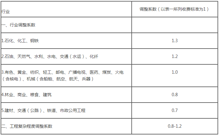 3.根據(jù)行業(yè)特點和各行業(yè)內部不同類別工程的復雜程度,計算咨詢費用時可分別乘以行業(yè)調整系數(shù)和工程復雜程度調整系數(shù)(見附件二)。