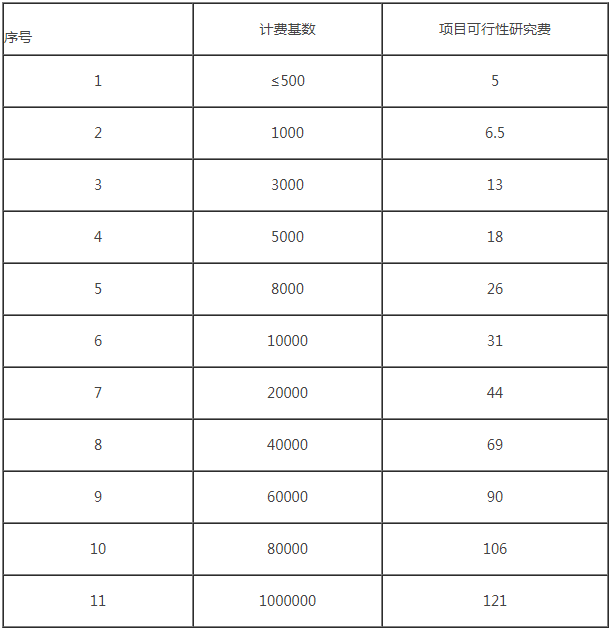 1、項目可行性研究費以工程施工費與設備購置費之和作為計費基數(shù),釆用分檔定額計費方式計算,各區(qū)間按內插法確定。項目可行性研究費計費標準