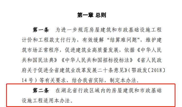自本辦法實施之日起,湖北省內(nèi)的房屋建筑和市政基礎(chǔ)設(shè)施工程適用本辦法,不區(qū)分資金性質(zhì)。施工工程是否必須適用本《暫行辦法》,則需結(jié)合項目進(jìn)展情況而定:已進(jìn)行招投標(biāo)或已簽訂合同的工程,仍按原約定執(zhí)行,已發(fā)包暫未確定中標(biāo)單位的,招標(biāo)人可發(fā)布澄清公告對結(jié)算方式進(jìn)行變更,也可以按原約定繼續(xù)進(jìn)行。