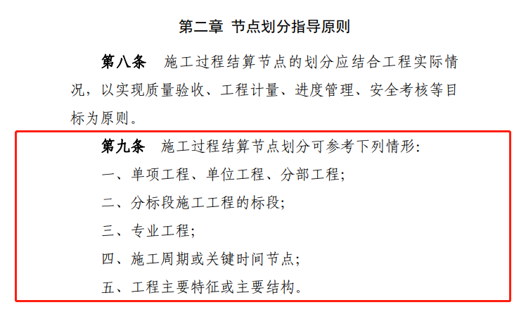 《暫行辦法》分為總則、節(jié)點劃分指導(dǎo)原則、招投標(biāo)與合同約定、結(jié)算與支付、監(jiān)督管理、附則等六個章節(jié),共二十六個條文,具體如下