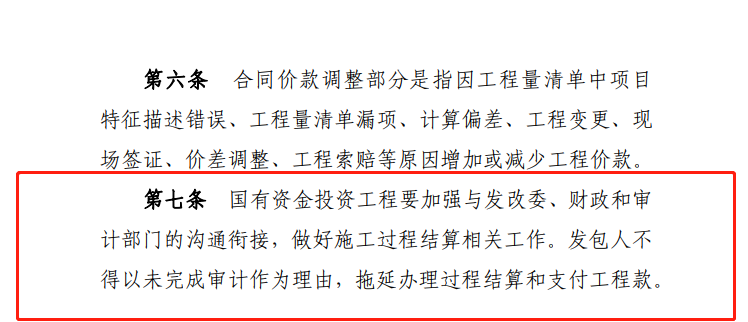 推行過程結(jié)算,建設(shè)單位應(yīng)滿足施工所需的資金安排,工程驗收通過時原則上應(yīng)同步完成工程款結(jié)算,不得變相拖延結(jié)算。國有資金投資工程應(yīng)當(dāng)按照國家有關(guān)規(guī)定確保資金按時支付到位,不得以未完成審計作為延期工程款結(jié)算的理由。在以往的建設(shè)工程司法案例中,合同雙方若在合同中約定以行政審計后的價款作為結(jié)算價款的,法院予以支持。眾所周知,行政審計一般在項目驗收完成之后進(jìn)行,那么在推行施工過程結(jié)算的背景下,發(fā)包人在招標(biāo)文件及合同條款中再約定以行政審計后的價款作為結(jié)算依據(jù)的,明顯與過程結(jié)算的推行意義相違背。