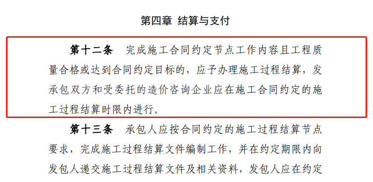 本條定義何為施工過程結(jié)算,相較住建部2021年發(fā)布的《建筑工程施工發(fā)包與承包計價管理辦法》(修訂征求意見稿)第十九條規(guī)定“全面推行施工過程結(jié)算和支付。發(fā)承包雙方通過合同約定,按時間節(jié)點或進(jìn)度節(jié)點對周期內(nèi)已完成且無爭議的工程量進(jìn)行價款計算、確認(rèn),并按照合同約定比例支付?!?span style=";margin: 0px; padding: 0px; outline: 0px; max-width: 100%;Helvetica Neue", "PingFang SC", "Hiragino Sans GB", "Microsoft YaHei UI", "Microsoft YaHei", Arial, sans-serif; text-align: justify; background-color: rgb(248, 248, 248); box-sizing: border-box !important; overflow-wrap: break-word !important;">《暫行辦法》增加了節(jié)點驗收,驗收是節(jié)點結(jié)算與支付的前提。