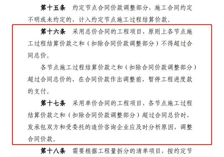 分別對總價合同的建設(shè)項目和單價合同的建設(shè)項目的施工過程結(jié)算的方式和過程進(jìn)行解釋、說明。總而言之,不管總價合同還是單價合同,施工過程結(jié)算價款之和(扣除合同價款調(diào)整部分)均不得超過合同總價,否則可能出現(xiàn)工程未完成已支付完成的情況。具體支付比例可根據(jù)發(fā)包人資金使用計劃在合同中約定,但不得低于當(dāng)?shù)匦姓鞴懿块T的相關(guān)規(guī)定。