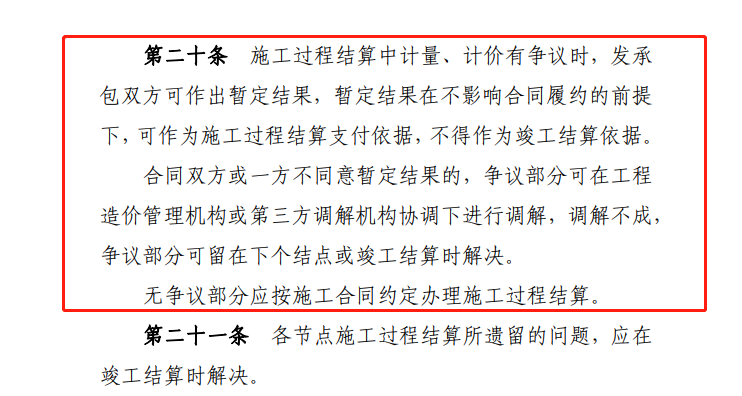 施工過程結(jié)算中計量、計價有爭議和無爭議兩種情形。對于有爭議部分,發(fā)承包雙方可作出暫定結(jié)果,并作為施工過程結(jié)算支付依據(jù),但不得作為竣工結(jié)算依據(jù),最終竣工結(jié)算按照雙方在調(diào)解后確定,或者在下個結(jié)點或者竣工結(jié)算時確定。