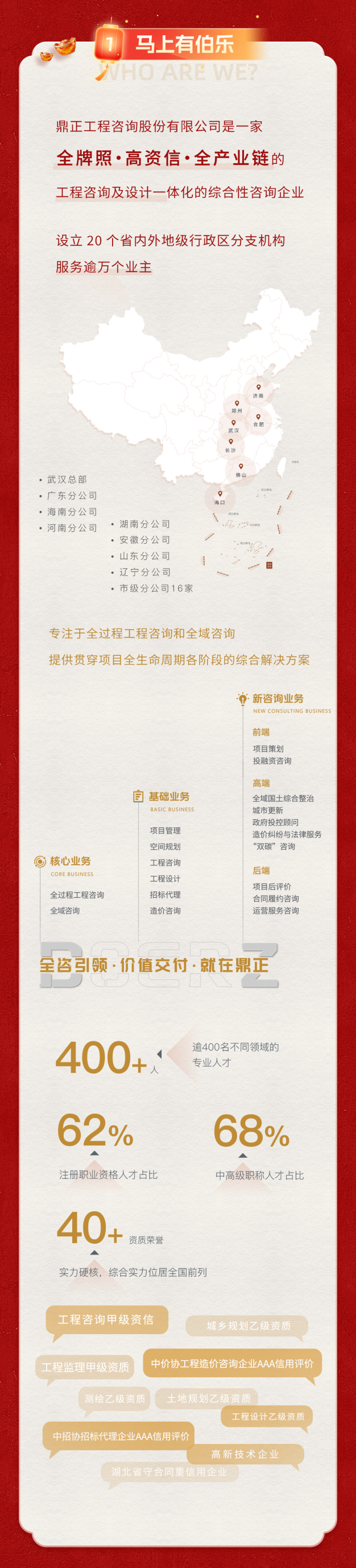 業(yè)績涉及各類公建、工業(yè)、能源、環(huán)保、交通、市政、城市軌道、國土整治等行業(yè),包括海內(nèi)外各類建設(shè)項目的工程咨詢、工程招標(biāo)代理、工程造價咨詢、項目管理等咨詢業(yè)務(wù)...