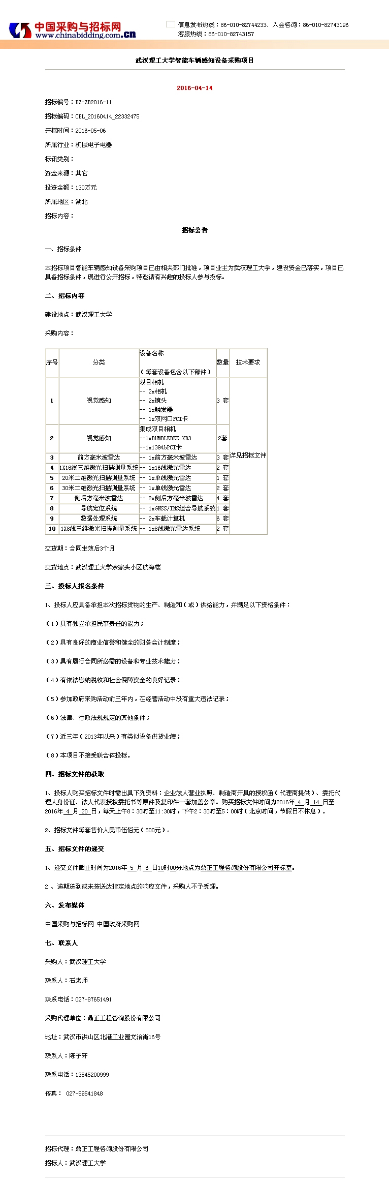 武漢理工大學(xué)智能車輛感知設(shè)備采購項目招標(biāo)公告