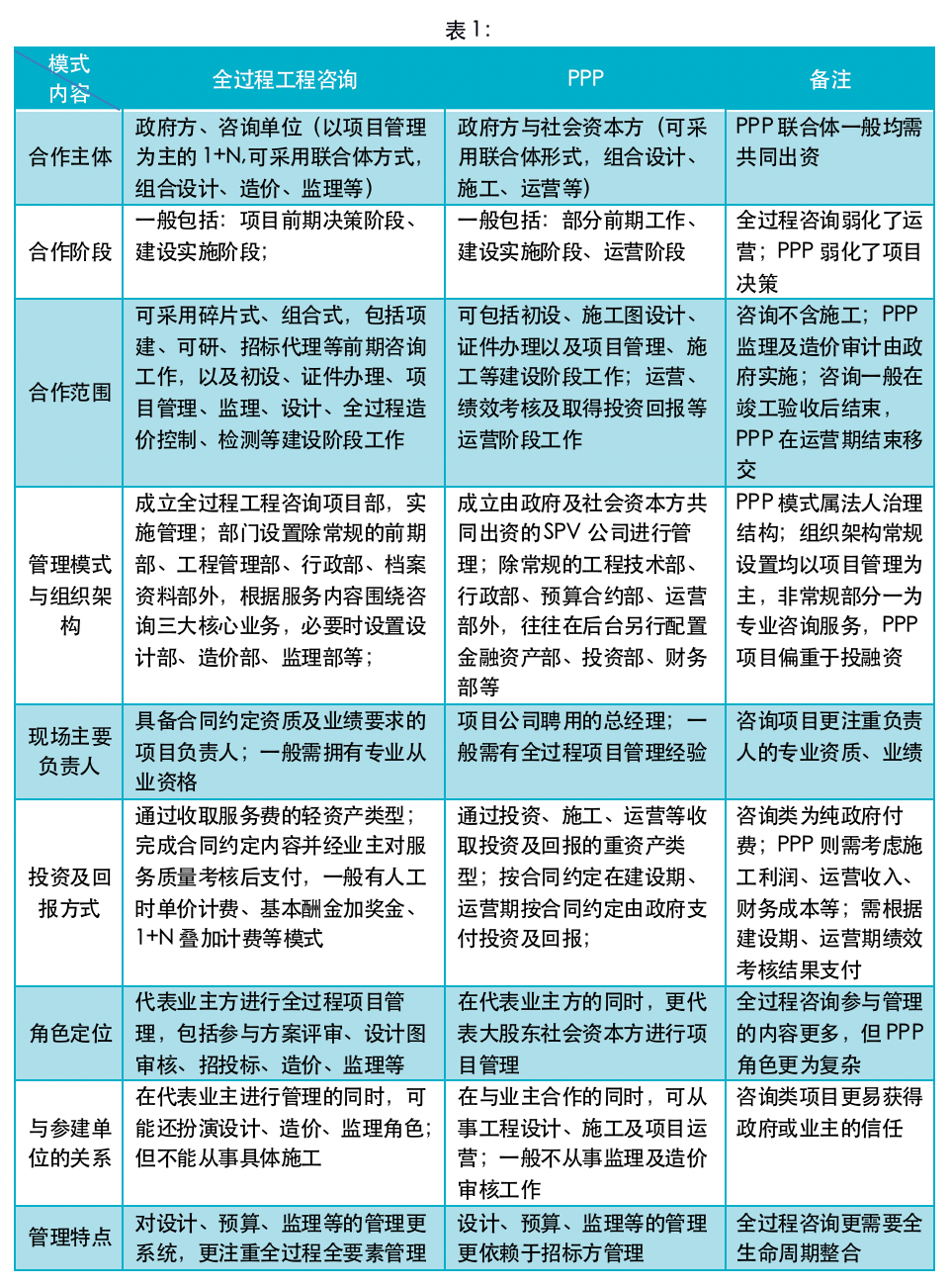 從上面的分析中不難看出,PPP項(xiàng)目關(guān)注合法合規(guī)手續(xù),全過程咨詢關(guān)注技術(shù)及管理協(xié)調(diào);PPP項(xiàng)目更關(guān)注投資收益及增值回報(bào),全過程咨詢關(guān)注投資控制及進(jìn)度;PPP項(xiàng)目服務(wù)鏈更長,全過程咨詢重點(diǎn)是建設(shè)期。
