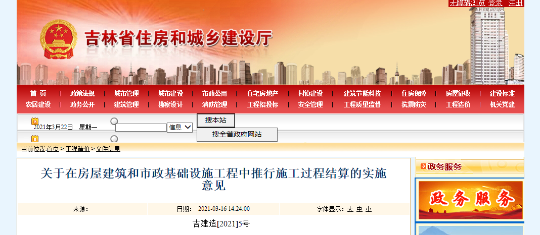 3月16日,吉林省住建廳發(fā)布《關于在房屋建筑和市政基礎設施工程中推行施工過程結(jié)算的實施意見》。施工合同工期一年(含一年)以上的房屋建筑和市政基礎設施工程,推行施工過程結(jié)算。鼓勵施工過程結(jié)算實行全過程造價咨詢服務: