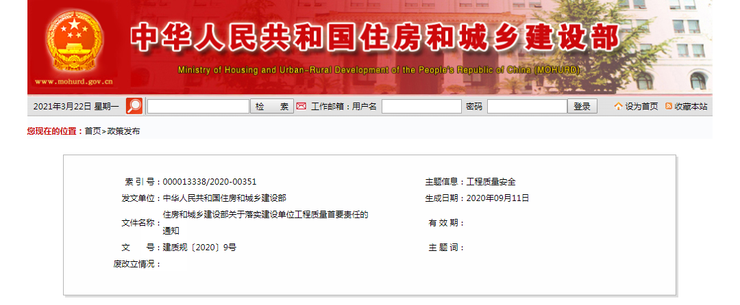 2020年9月23日,住建部官網(wǎng)發(fā)布《關于落實建設單位工程質(zhì)量首要責任的通知》,嚴格落實建設單位工程質(zhì)量首要責任。同時提出: