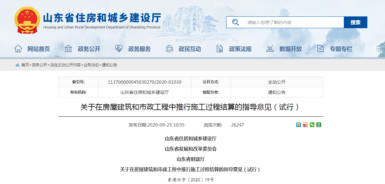 2020年9月17日,山東省住房城鄉(xiāng)建設廳、省發(fā)展改革委、省財政廳三部門聯(lián)合印發(fā)《關于在房屋建筑和市政工程中推行施工過程結(jié)算的指導意見(試行)》,通過規(guī)范結(jié)算行為,縮短結(jié)算周期,減輕企業(yè)負擔: