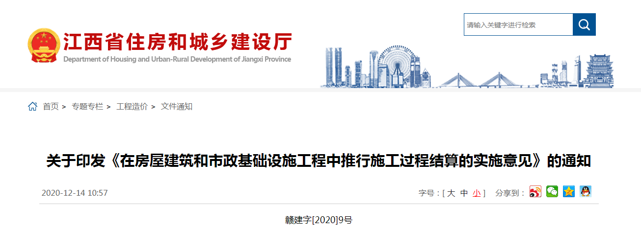 2020年12月14日,江西省住建廳發(fā)布通知,印發(fā)《在房屋建筑和市政基礎設施工程中推行施工過程結(jié)算的實施意見》,自下文之日起施行。
