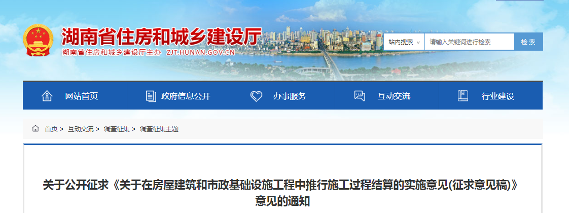 2020年5月28日,湖南省住建廳發(fā)布《關于在房屋建筑和市政基礎設施工程中推行施工過程結(jié)算的實施意見(征求意見稿)》,在省內(nèi)房建、市政項目中全面推行施工過程結(jié)算。