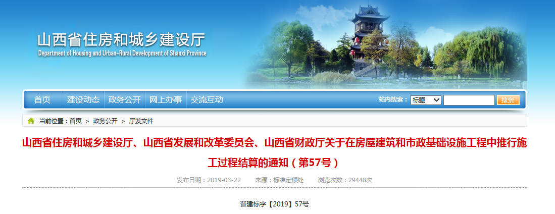 2019年3月22日,《山西省住房和城鄉(xiāng)建設廳、山西省發(fā)展和改革委員會、山西省財政廳關于在房屋建筑和市政基礎設施工程中推行施工過程結(jié)算的通知(第57號)》(以下簡稱《通知》)發(fā)布,從5月1日起,在房建和市政工程中推行施工過程結(jié)算: