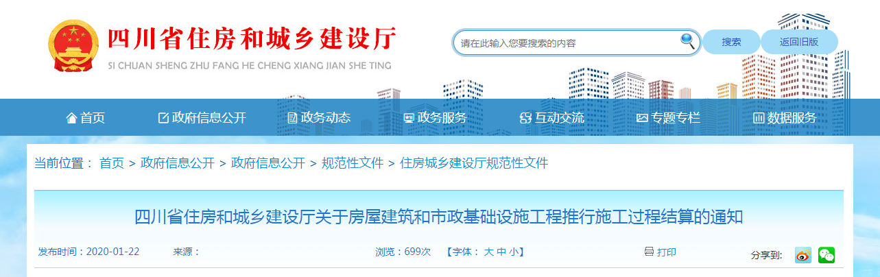 2020年1月22日,四川發(fā)文,全省房屋建筑和市政基礎設施工程施工合同工期兩年以上的新開工項目要積極推行施工過程結(jié)算。從2020年3月1日起執(zhí)行,有效期5年。