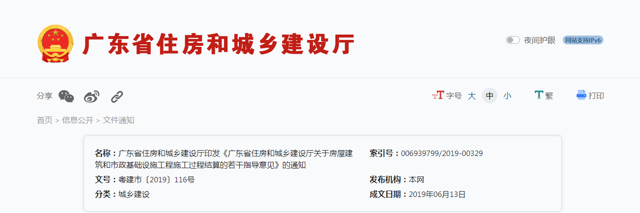 2019年6月13日,廣東省住建廳印發(fā)通知,推進全省房屋建筑和市政基礎設施工程施工過程結(jié)算。