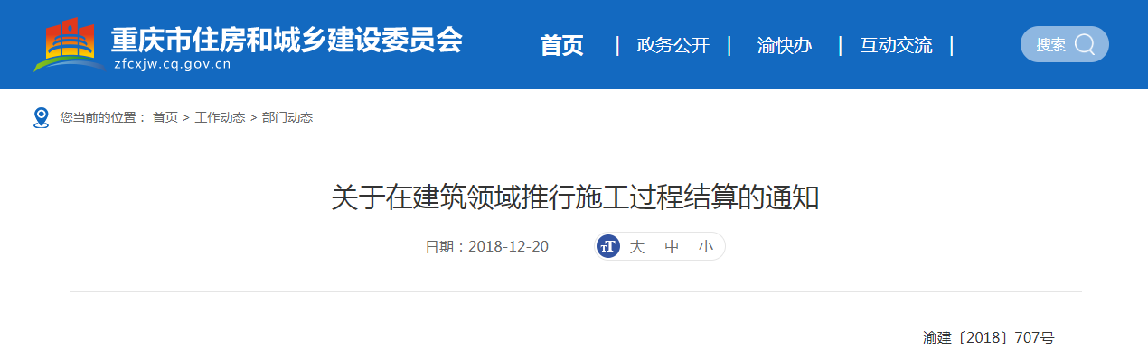 2018年12月20日,重慶市住建委發(fā)布《關于在建筑領域推行施工過程結(jié)算的通知》,要求:新開工、建設工期兩年以上工程,推行施工過程結(jié)算。