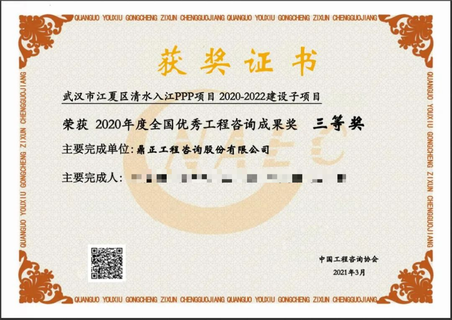 2021年3月5日,中國工程咨詢協(xié)會(huì)公布了“2020年度全國優(yōu)秀工程咨詢成果獎(jiǎng)”獲獎(jiǎng)項(xiàng)目名單,鼎正咨詢繼2019年全咨項(xiàng)目榮獲全國優(yōu)秀工程咨詢成果獎(jiǎng)后,又一PPP咨詢項(xiàng)目——由鼎正咨詢獨(dú)立編制完成的“武漢市江夏區(qū)清水入江PPP項(xiàng)目 2020-2022建設(shè)子項(xiàng)目”實(shí)施方案再度榮獲全國優(yōu)秀工程咨詢成果三等獎(jiǎng)!