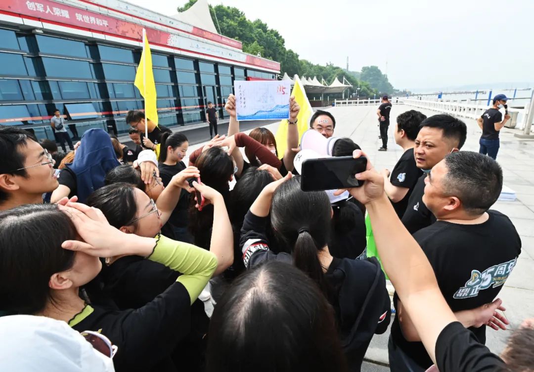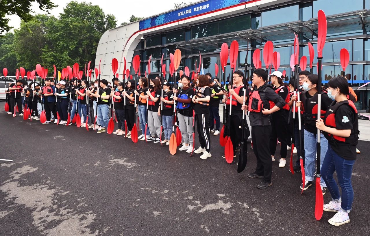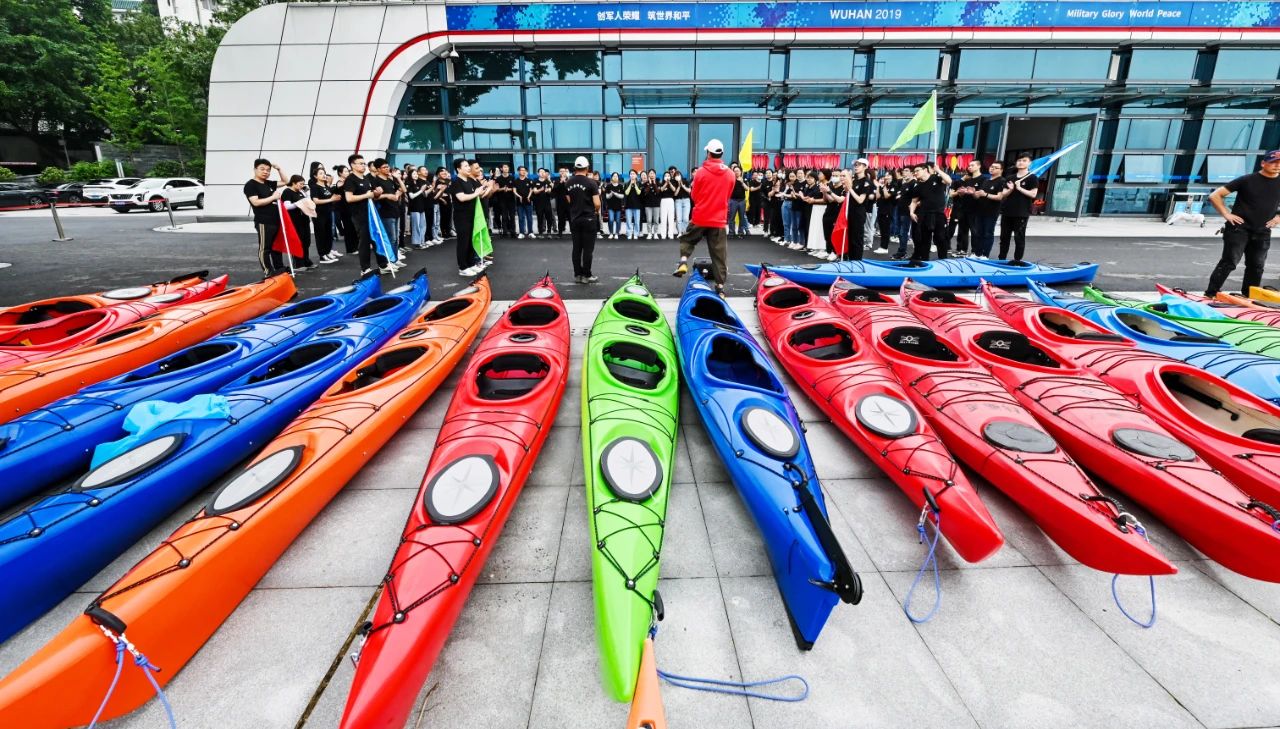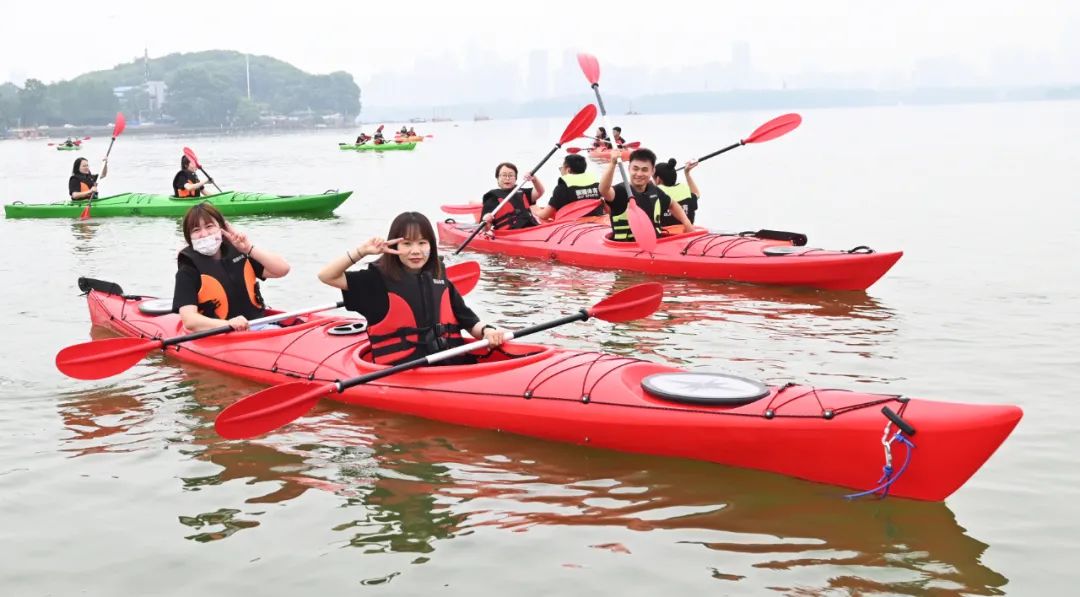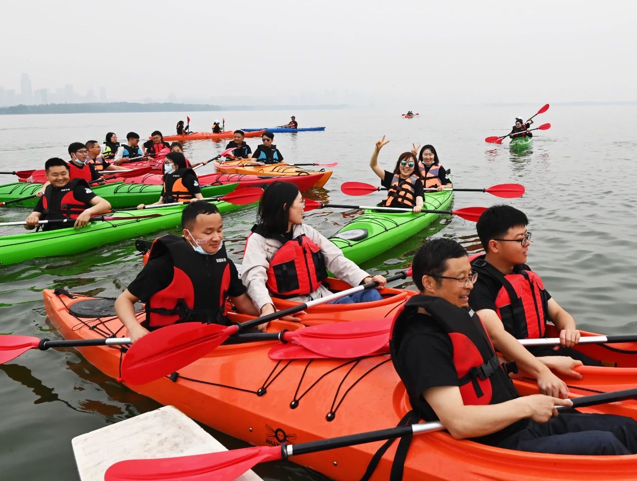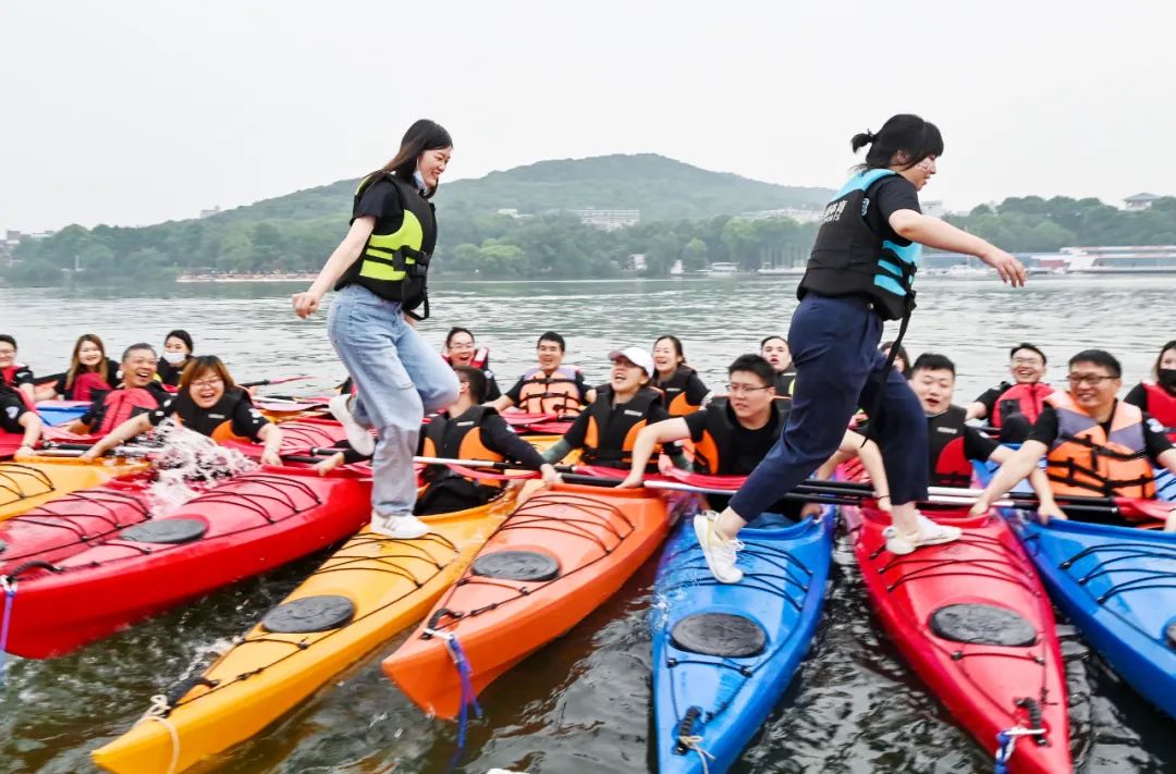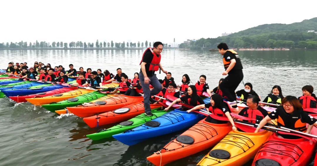 接下來(lái)是皮劃艇環(huán)節(jié),五顏六色的皮劃艇整齊的排列在地上,小伙伴們?cè)缫哑炔患按拇┥狭司壬拢闷鹆舜瑯?,整齊的方陣蠢蠢欲動(dòng),頗有“百萬(wàn)雄師過(guò)大江”的氣勢(shì)。
