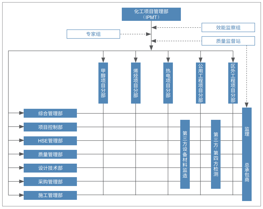 二是文件適用范圍。文件使用范圍包括PMC/IPMT團隊內(nèi)部管控;業(yè)主與項目管理公司接口協(xié)調(diào)與管控;管控EPC、監(jiān)理等各類參建單位;與政府主管部門協(xié)調(diào);覆蓋工程建設(shè)全過程(各階段、各專業(yè))5類。三是文件發(fā)布。項目管理體系文件由PMC編制,經(jīng)業(yè)主批準后發(fā)布;涉及管控EPC、監(jiān)理等參建單位的,應(yīng)列入招/議標文件發(fā)布。四是文件的價值。迅速整合業(yè)主項目管理團隊(PMC/IPMT)的工作,使其管理有序、科學(xué)合理、專業(yè)透明;符合法律、法規(guī)和政府監(jiān)管要求,奠定工程建設(shè)有序推進基礎(chǔ);業(yè)主管理文件(對項目執(zhí)行的具體要求)列入招/議標文件有利于承包商等投標人進行準確報價、作出承諾和響應(yīng),縮短中標后合同談判時間,業(yè)主管理文件成為合同附件(有法律約束力),將顯著減少合同糾紛。矩陣式管理結(jié)構(gòu),是常見的組織結(jié)構(gòu)形式之一。PMC/IPMT團隊即是業(yè)主方項目管理團隊,是工程建設(shè)的中樞指揮機構(gòu),其組織機構(gòu)的設(shè)計至關(guān)重要。項目的組織結(jié)構(gòu)形式一般有:職能型、項目型、矩陣型。通過大量工程建設(shè)實踐驗證,矩陣式管理結(jié)構(gòu)(矩陣型)是能夠迅速整合業(yè)主項目管理團隊(PMC/IPMT)的良好的項目組織結(jié)構(gòu)形式(圖3)。矩陣式管理結(jié)構(gòu)特征主要包括:一是項目部,主要解決“干什么”,負責執(zhí)行并完成項目工作;二是職能/專業(yè)部門,主要解決“怎么干”,為項目部提供技術(shù)支持。▲圖3 矩陣型組織結(jié)構(gòu)原理示意圖