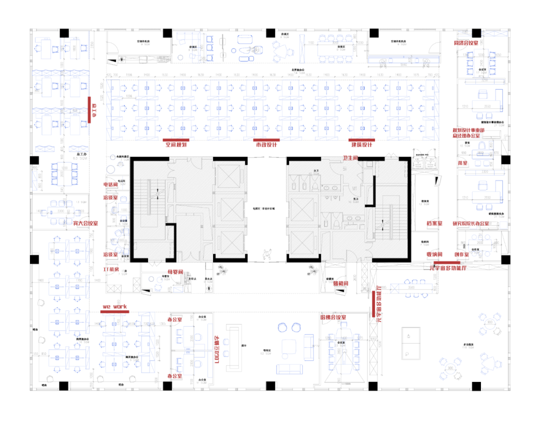 在空間規(guī)劃上,我們根據(jù)工作方式的特點(diǎn),充分考慮功能與不同情境的活動(dòng)需求,打造鼓勵(lì)與展示創(chuàng)意過程的空間氛圍。在這里,設(shè)計(jì)師們可以頭腦風(fēng)暴、集思廣益、舌戰(zhàn)群儒;亦可以舉辦各種形式的研討與社交活動(dòng);還可作為規(guī)劃設(shè)計(jì)事業(yè)部對(duì)外展示與交流的窗口。