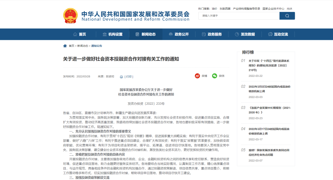 3月28日,國家發(fā)展改革委辦公廳印發(fā)《關于進一步做好社會資本投融資合作對接有關工作的通知》(以下簡稱《通知》),部署各地積極采取有效措施,進一步做好投融資合作對接工作。
