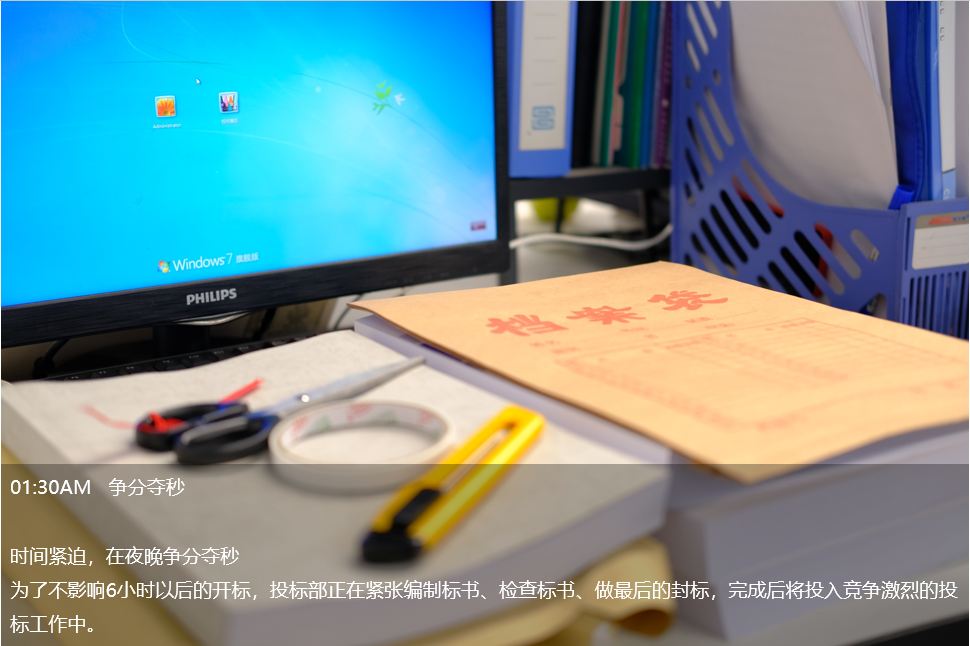 凌晨1點(diǎn),投標(biāo)部毓兒還在趕標(biāo)書,這是她這個月第五份標(biāo)書,已經(jīng)連續(xù)熬了四個晚上。她說:“對于投標(biāo)人說,有一大半的標(biāo)書,都是在半夜里完成的。尤其是臨近開標(biāo)的前兩天,基本都會加班到很晚?!?/span>