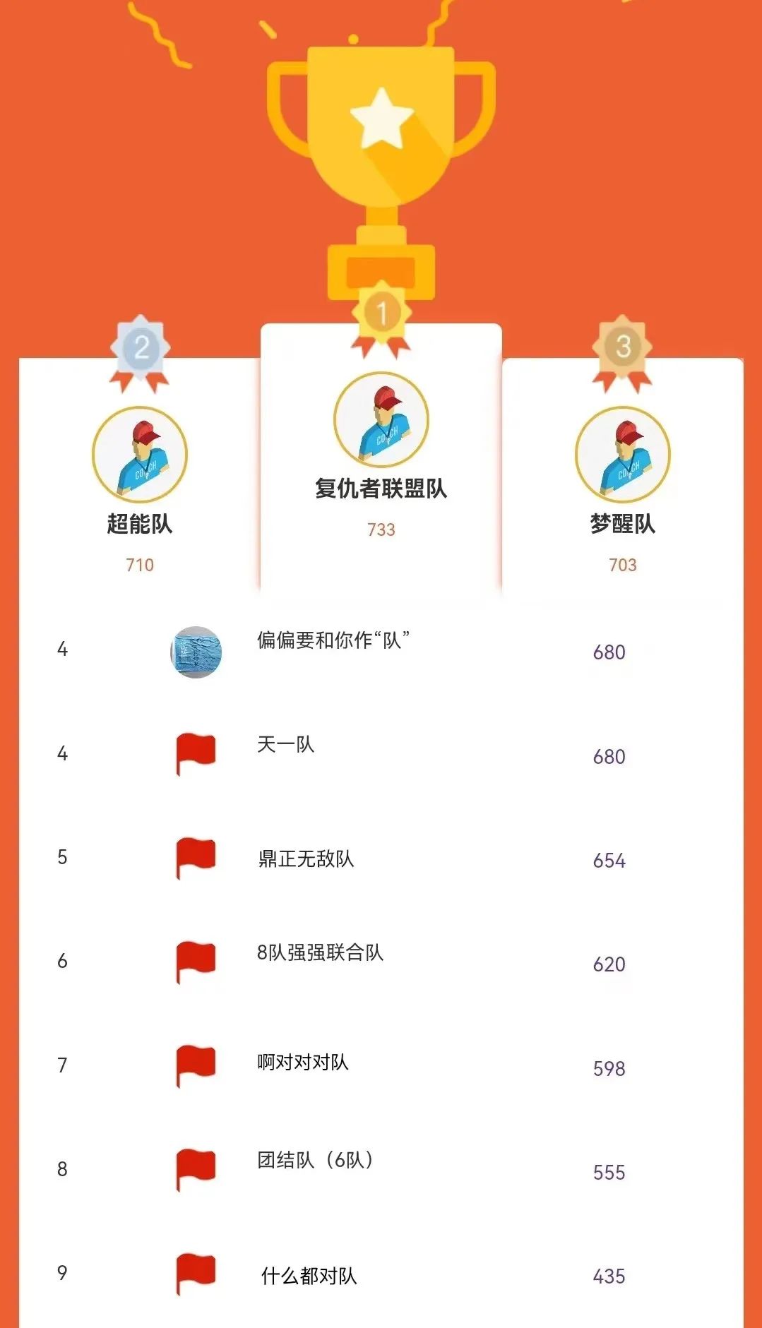 大家好,我們是“偏偏要和你作‘隊(duì)’”、“強(qiáng)強(qiáng)聯(lián)合隊(duì)”、“復(fù)仇者聯(lián)盟隊(duì)”、“鼎正無敵隊(duì)”、“啊對(duì)對(duì)對(duì)隊(duì)”、“超能隊(duì)”、“天一隊(duì)”、“團(tuán)結(jié)隊(duì)”、“夢(mèng)醒隊(duì)”、“什么都對(duì)隊(duì)”。