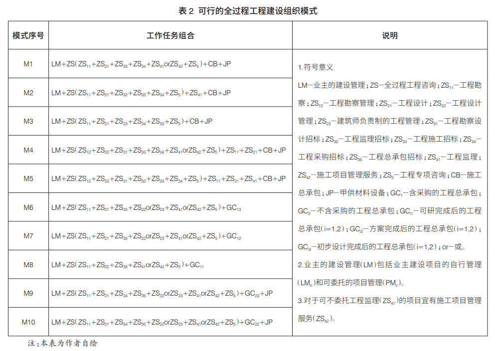 國(guó)家鼓勵(lì)多種形式的全過程工程咨詢服務(wù)模式,服務(wù)內(nèi)容可以是跨階段組合或同一階段內(nèi)不同類型的組合。據(jù)筆者調(diào)查,目前業(yè)界認(rèn)可度較高的全過程工程咨詢內(nèi)容主要包括勘察設(shè)計(jì)、招標(biāo)采購、監(jiān)理與施工項(xiàng)目管理服務(wù)以及工程專項(xiàng)咨詢。其中,工程勘察設(shè)計(jì)咨詢分為工程勘察設(shè)計(jì)和勘察設(shè)計(jì)管理服務(wù)兩種類型;工程專項(xiàng)咨詢包括項(xiàng)目融資、工程造價(jià)、信息技術(shù)等業(yè)主所需求的咨詢服務(wù)?;谶@一認(rèn)識(shí),筆者梳理了建設(shè)、勘察設(shè)計(jì)、監(jiān)理、施工等單位在工程建設(shè)中的關(guān)系組合,并列出工程建設(shè)全過程主要的建設(shè)組織模式,如表2所示。