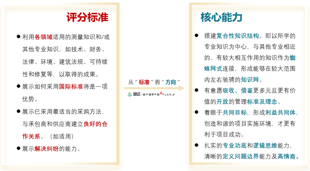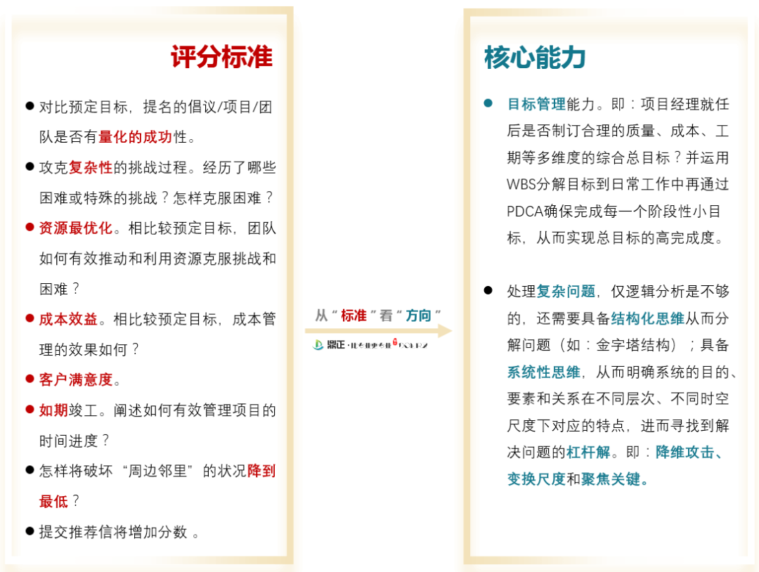 通過(guò)此次評(píng)獎(jiǎng)申報(bào)過(guò)程中的思考與體會(huì),我們想從RICS中國(guó)獎(jiǎng)評(píng)分標(biāo)準(zhǔn)談?wù)勴?xiàng)目經(jīng)理的努力方向。無(wú)論是投資決策咨詢(xún)、規(guī)劃設(shè)計(jì),還是政府采購(gòu)與招標(biāo)代理、工程造價(jià)咨詢(xún)、工程監(jiān)理及項(xiàng)目管理咨詢(xún)的項(xiàng)目經(jīng)理,都需要明確?優(yōu)秀的項(xiàng)目管理是什么樣的?要實(shí)現(xiàn)這些成果需要培養(yǎng)并精進(jìn)哪些核心能力?