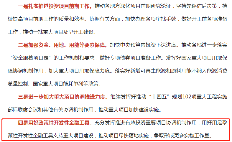 國(guó)常會(huì)提出的政策性、開發(fā)性金融工具為項(xiàng)目資本金又增加了一個(gè)新的資金渠道,可以更大程度的撬動(dòng)市場(chǎng)資金,引導(dǎo)金融機(jī)構(gòu)加大配套融資支持,吸引民間資本參與。目前各省市正積極推進(jìn)政策性、開發(fā)性金融工具項(xiàng)目申報(bào)組織和資金投發(fā)等工作,持續(xù)提升地方金融治理能力,優(yōu)化區(qū)域金融創(chuàng)新結(jié)構(gòu),從而不斷激活金融資源流入,促進(jìn)基礎(chǔ)設(shè)施投資、助力重大項(xiàng)目建設(shè)。