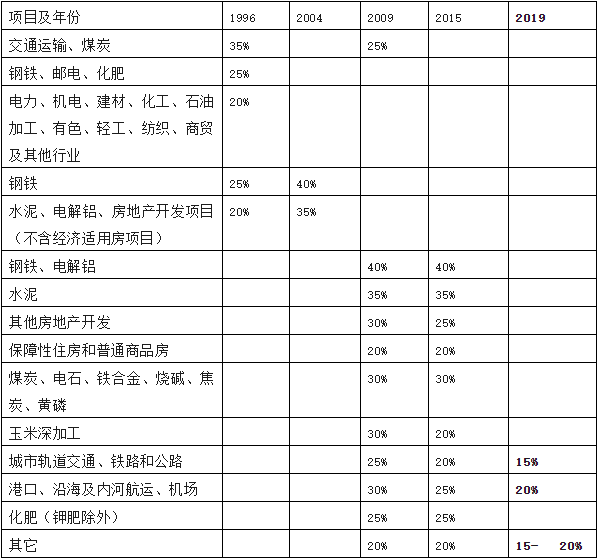 國(guó)發(fā)〔1996)35號(hào)規(guī)定了項(xiàng)目資本金占總投資最低比例,后續(xù)年份多次發(fā)文調(diào)整,具體整理如下: