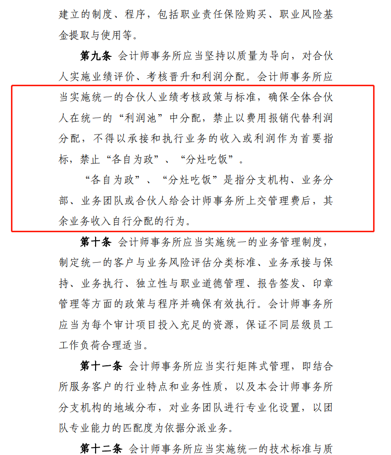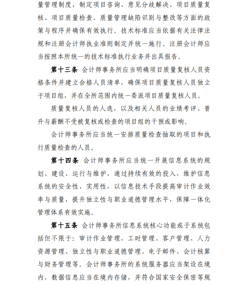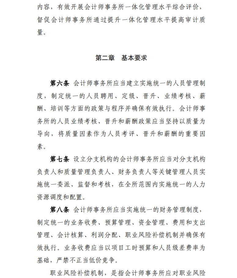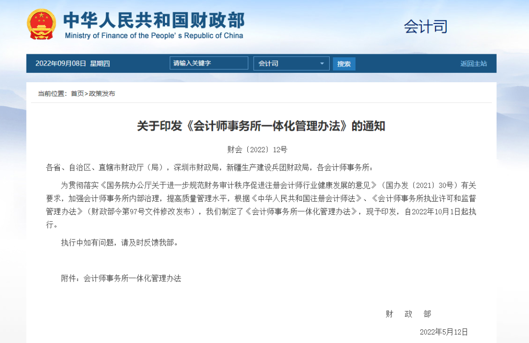 為貫徹落實(shí)《國(guó)務(wù)院辦公廳關(guān)于進(jìn)一步規(guī)范財(cái)務(wù)審計(jì)秩序促進(jìn)注冊(cè)會(huì)計(jì)師行業(yè)健康發(fā)展的意見(jiàn)》(國(guó)辦發(fā)〔2021〕30號(hào))有關(guān)要求,加強(qiáng)會(huì)計(jì)師事務(wù)所內(nèi)部治理,提高質(zhì)量管理水平,根據(jù)《中華人民共和國(guó)注冊(cè)會(huì)計(jì)師法》、《會(huì)計(jì)師事務(wù)所執(zhí)業(yè)許可和監(jiān)督管理辦法》(財(cái)政部令第97號(hào)文件修改發(fā)布),我們制定了《會(huì)計(jì)師事務(wù)所一體化管理辦法》,現(xiàn)予印發(fā),自2022年10月1日起執(zhí)行。