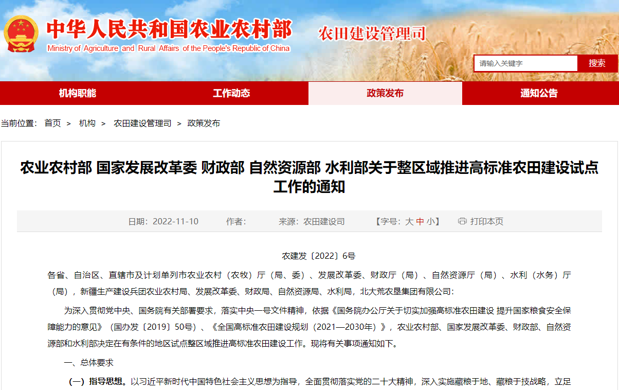 為深入貫徹黨中央、國(guó)務(wù)院有關(guān)部署要求,落實(shí)中央一號(hào)文件精神,依據(jù)《國(guó)務(wù)院辦公廳關(guān)于切實(shí)加強(qiáng)高標(biāo)準(zhǔn)農(nóng)田建設(shè) 提升國(guó)家糧食安全保障能力的意見(jiàn)》(國(guó)辦發(fā)〔2019〕50號(hào))、《全國(guó)高標(biāo)準(zhǔn)農(nóng)田建設(shè)規(guī)劃(2021—2030年)》,農(nóng)業(yè)農(nóng)村部、國(guó)家發(fā)展改革委、財(cái)政部、自然資源部和水利部決定在有條件的地區(qū)試點(diǎn)整區(qū)域推進(jìn)高標(biāo)準(zhǔn)農(nóng)田建設(shè)工作?,F(xiàn)將有關(guān)事項(xiàng)通知如下。