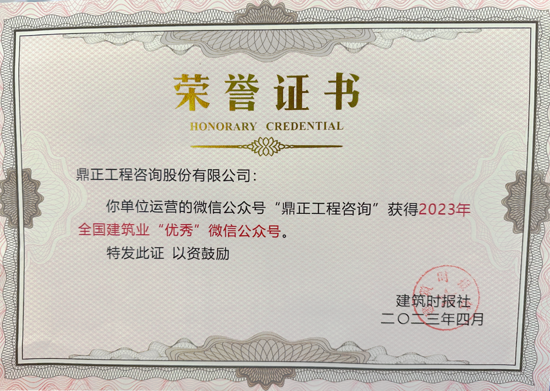 4月20日,由建筑時報主辦的2023年建筑業(yè)微信公眾號運(yùn)維經(jīng)驗交流研討會暨全國建筑業(yè)優(yōu)秀公眾號頒獎典禮在廣西南寧舉辦。鼎正官方微信公眾號“鼎正工程咨詢”再度榮獲“全國建筑業(yè)優(yōu)秀微信公眾號”榮譽(yù)稱號。
