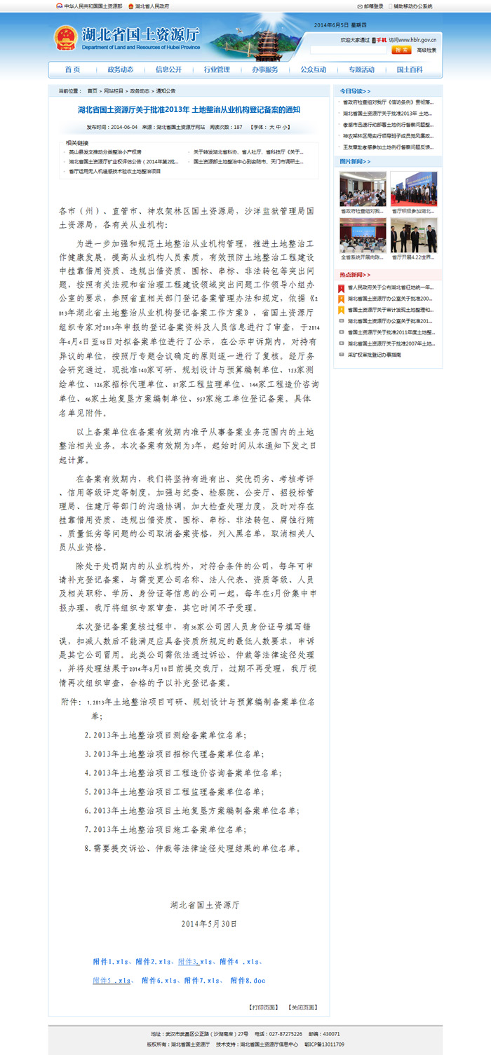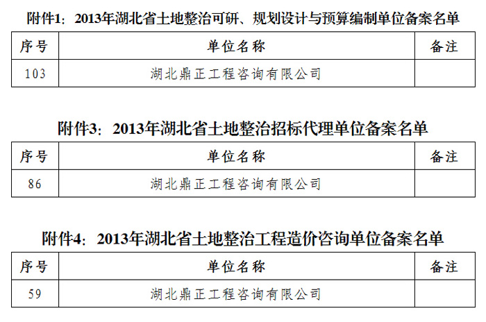 祝賀我司所有相關(guān)業(yè)務(wù)均通過湖北省國土資源廳2013土整從業(yè)機(jī)構(gòu)備案