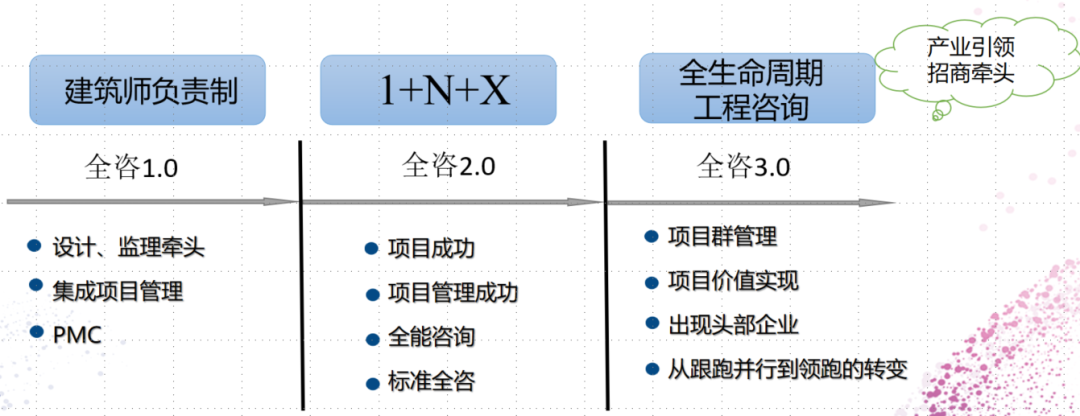 在總書記全生命周期管理思想的指導(dǎo)下,中國的“全咨”已經(jīng)由“全過程工程咨詢”過渡到“全生命周期工程咨詢”,進入了全咨3.0時代。全咨3.0要點是全咨邊界向前擴展到“招商引資”,向后延伸至“運營維護”。