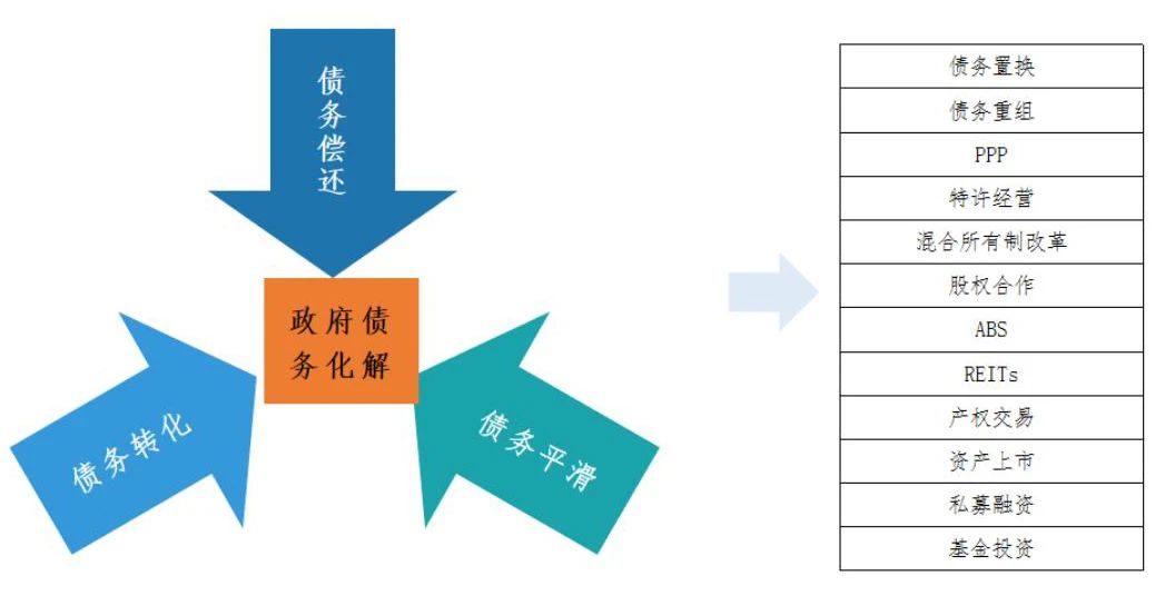 結(jié)合國家相關(guān)政策、學(xué)術(shù)理論以及實踐經(jīng)驗,我們提出了圍繞“債務(wù)平滑、債務(wù)轉(zhuǎn)化、債務(wù)償還”三大策略方向,主要運用“債務(wù)置換、債務(wù)重組、PPP、特許經(jīng)營、混合所有制改革、股權(quán)合作、ABS、REITs、產(chǎn)權(quán)交易、資產(chǎn)上市、私募融資、基金投資”十二種工具,建立明確的債務(wù)化解規(guī)劃,制定分年度債務(wù)化解目標(biāo),切實有效實現(xiàn)政府隱性債的化解,促進地方政府投融資運作健康可持續(xù)。