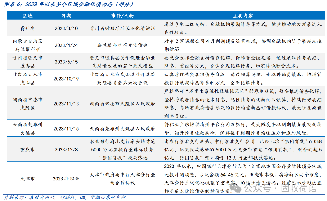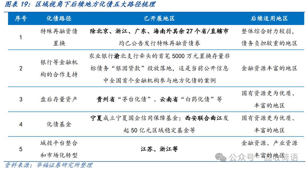 財(cái)政部《地方全口徑債務(wù)清查統(tǒng)計(jì)填報(bào)說(shuō)明》中提出六種常見的債務(wù)化解舉措,具體為(1)安排財(cái)政資金償還;(2)出讓政府股權(quán)以及經(jīng)營(yíng)性國(guó)有資產(chǎn)權(quán)益償還;(3)利用項(xiàng)目結(jié)轉(zhuǎn)資金、經(jīng)營(yíng)收入償還;(4)合規(guī)轉(zhuǎn)化為企業(yè)經(jīng)營(yíng)性債務(wù);(5)通過借新還舊、展期等方式償還;(6)采取破產(chǎn)重整或清算方式化解。同時(shí),根據(jù)各地化債動(dòng)態(tài)表述,各地根據(jù)自身情況,積極探索了金融機(jī)構(gòu)貸款置換、城投平臺(tái)整合或轉(zhuǎn)型、特殊再融資債置換、設(shè)立化債基金等方式推動(dòng)化債進(jìn)程。