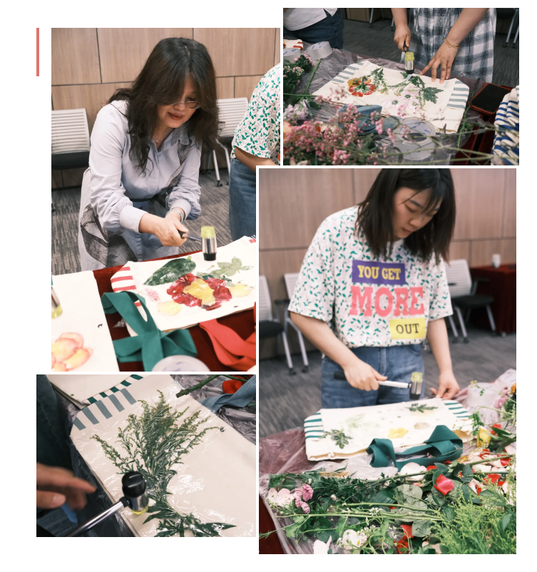 本次母親節(jié)創(chuàng)意植物拓染活動(dòng),不僅是一次藝術(shù)創(chuàng)作體驗(yàn),更是一場(chǎng)心靈的放松之旅,幫助媽媽們釋放日常生活的壓力,“敲敲”找回快樂的自己。