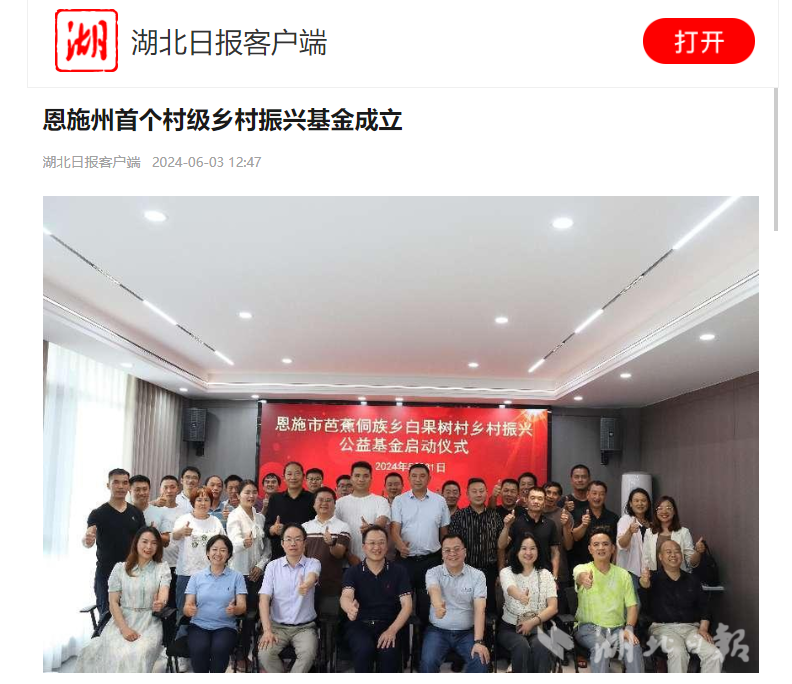 5月31日下午,恩施市芭蕉侗族鄉(xiāng)白果樹村鄉(xiāng)村振興公益基金在白果樹村正式啟動,這是恩施州首個村級鄉(xiāng)村振興基金,也是白果樹村加快推進鄉(xiāng)村振興的最新創(chuàng)舉。