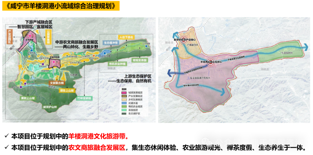 堅持下位規(guī)劃服從上位規(guī)劃、下級規(guī)劃服務上級規(guī)劃,形成流域治理“一盤棋”。落實上位規(guī)劃對本項目的定位、功能、治理重點等的相關要求,找準自身工作的側重點以及與全局工作的結合點,才能保證設計“不偏題”。以本項目為例,上位規(guī)劃將羊樓洞港小流域劃分為三個治理區(qū),本項目位于農(nóng)文商旅融合發(fā)展區(qū)和羊樓洞港文化旅游帶,因此本項目不僅要關注到水生態(tài)、水環(huán)境的修復提升,還要考慮流域生態(tài)價值的轉化及對旅游產(chǎn)業(yè)的推動,利用好流域內(nèi)的茶產(chǎn)業(yè)特色以及茶馬古鎮(zhèn)的歷史文化特色,實現(xiàn)生態(tài)美與產(chǎn)業(yè)綠深度融合。