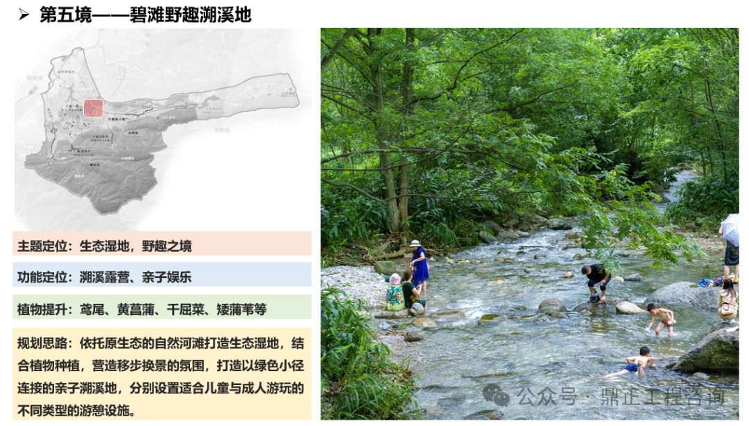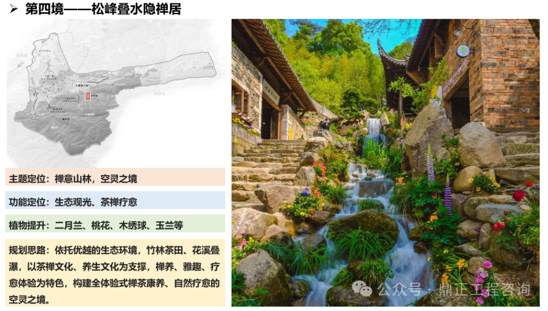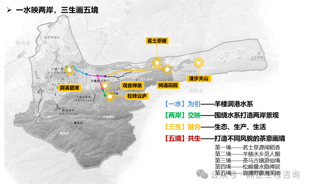 一水為引,指出治理對象,即羊樓洞港小流域;兩岸交映,指出治理范圍,即包括上下游、左右岸、堤內(nèi)外;三生融合,指出治理路徑,即走好生產(chǎn)、生活、生態(tài)協(xié)調發(fā)展之路;五境共生,即為五個治理分區(qū),通過分段體現(xiàn)差異化分區(qū)的理念,以線帶面也利于實施過程中分期分段逐步推進。每個分區(qū)都有具體的功能定位、治理目標、治理標準,因此不同分區(qū)名稱就是該區(qū)治理特色的高度凝練,既要體現(xiàn)水系的區(qū)位,如“茗士泉源”對應相公泉,“茶馬古鎮(zhèn)”對應羊樓洞古鎮(zhèn),“松峰”對應松峰山;也要體現(xiàn)水系的形態(tài),如“泉”、“溪”、“疊水”等;還要體現(xiàn)水系的功能,如“稻香”對應田園塘渠,“水鄉(xiāng)”對應生活河道,“碧灘”對應生態(tài)濕地等。