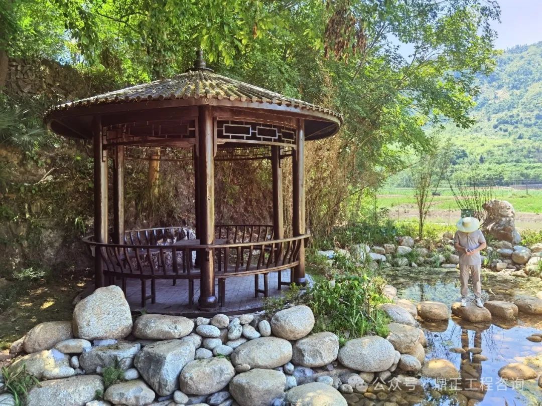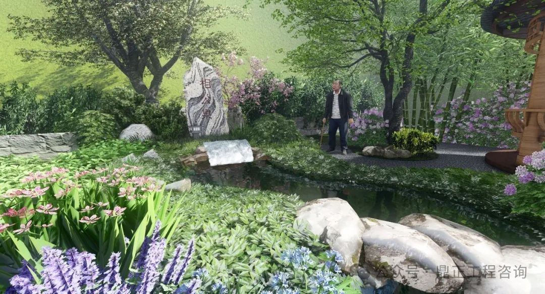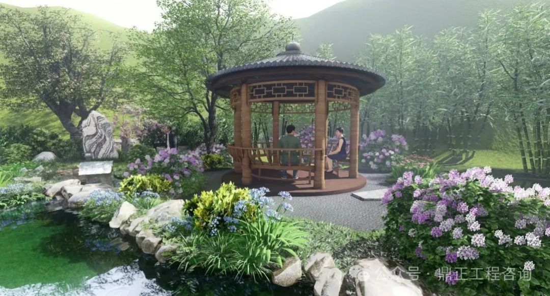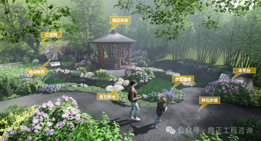 水景觀水文化打造:通過深挖相公泉歷史文化內(nèi)涵,進行本地印象提煉?!跋喙币辉~在古代,是妻子對丈夫的稱呼,也是君子、生員(秀才、相公)、宰相的另一種叫法。君子愛茶,沏茶品茗,修煉品性,以茶可雅志,茶是象征著塵世的純潔。設計從自然山水出發(fā),落位于閑情逸致設計基調,泉眼處采用題字景石配上一棵姿態(tài)旖旎的紅豆,視線端頭一幅竹影錦鯉、花木跌水的畫面映入眼簾,兩側的樹木林立,開合有致,整個節(jié)點的中心是一座圓頂茶亭,在亭中,一壺清茶問道,仿佛拉近了古今往事,也增加了場地的記憶,呈現(xiàn)出 “千年古樹頻招手,萬年清泉溢清香”的意境。