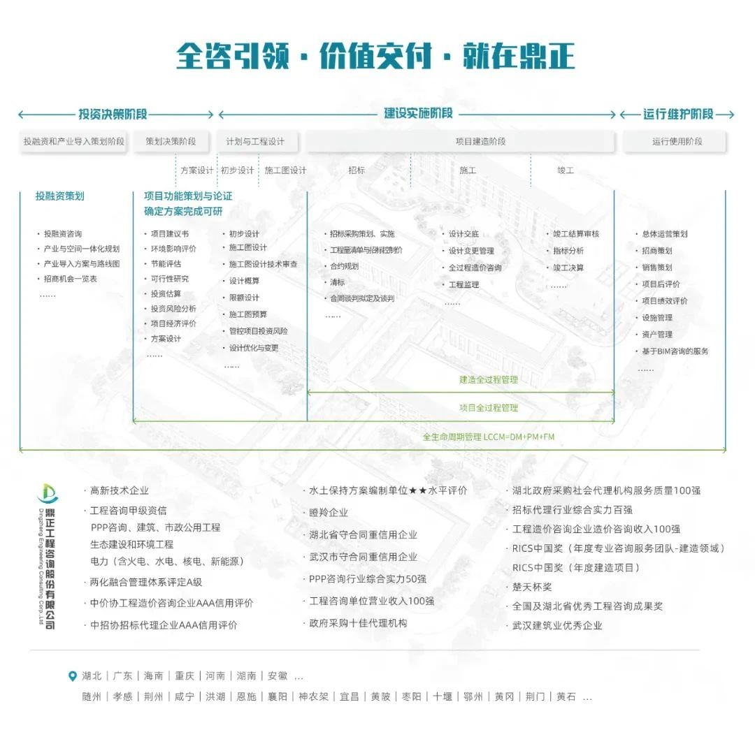 鼎正業(yè)務(wù)涵蓋設(shè)計(jì)咨詢產(chǎn)業(yè)鏈及工程產(chǎn)品產(chǎn)業(yè)鏈,既包括居住建筑、公共建筑、工業(yè)建筑等建筑設(shè)計(jì)領(lǐng)域,市政排水設(shè)計(jì)、市政道路設(shè)計(jì)等市政設(shè)計(jì)領(lǐng)域及景觀綠化設(shè)計(jì)領(lǐng)域,也包括全過程工程咨詢、全過程產(chǎn)業(yè)咨詢、投融資咨詢、項(xiàng)目管理、造價(jià)咨詢、造價(jià)與法律糾紛咨詢、招標(biāo)代理等工程投資、造價(jià)、運(yùn)營等業(yè)務(wù)。