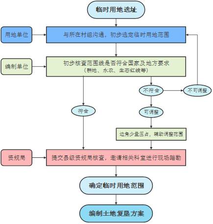 需先確定臨時用地位置及范圍,經(jīng)自然資源主管部門核查確認后,再開展土地復墾方案編制、臨時用地報批等后續(xù)工作,以防止項目開展后出現(xiàn)自然資源主管部門單位審批不通過或不了解項目情況、臨時用地范圍不可行等情況,導致項目停滯及反復溝通等問題。