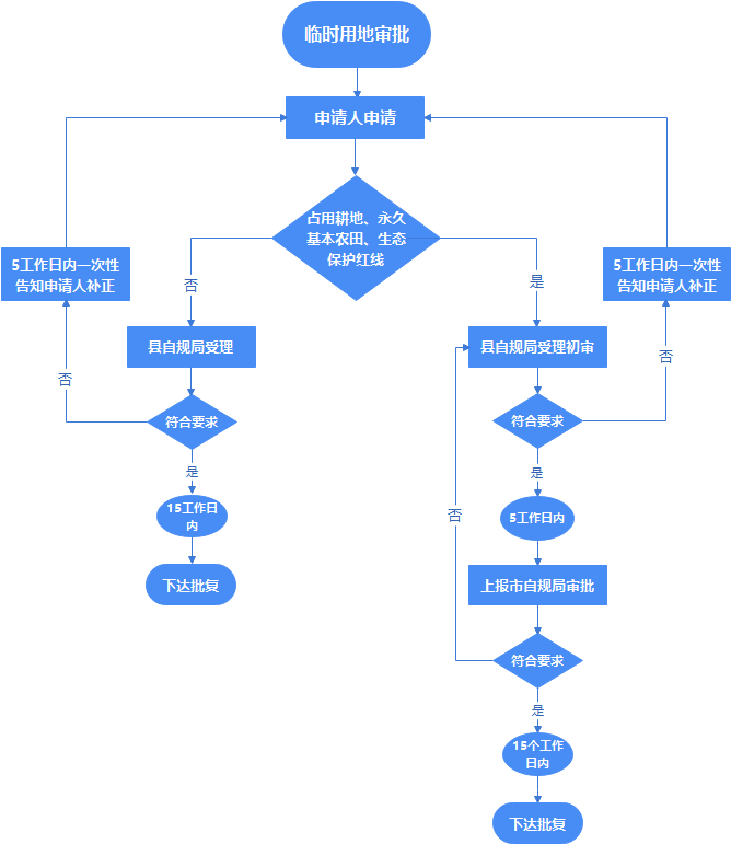 1、申請人向臨時用地所在地的縣(市、區(qū))自然資源主管部門提出申請,由縣(市、區(qū))自然資源主管部門負責辦理臨時用地審批。