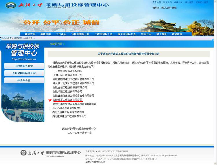我公司入圍武漢大學建設工程造價咨詢機構(gòu)信息庫,此次遴選面向全國工程造價咨詢企業(yè)進行招標,共入圍10家企業(yè),主要為武漢大學提供建設工程項目工程量清單與招標控制價編制與審核、全過程造價控制、竣工結(jié)算審核等相關服務。