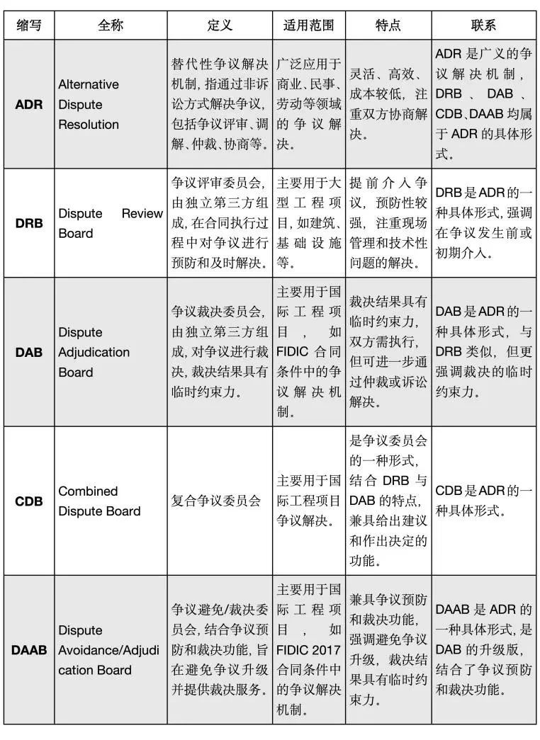《替代性爭(zhēng)議解決機(jī)制(ADR)中爭(zhēng)議評(píng)審/裁決機(jī)制(DRB/DAB)的由來(lái)及演進(jìn)》一文已經(jīng)詳細(xì)介紹了ADR(Alternative Dispute Resolution)替代性爭(zhēng)議解決機(jī)制的概念及起源,以及在這種爭(zhēng)議解決方式下DRB/DAB(Dispute Review Board/Adjudication Board)爭(zhēng)議評(píng)審/裁決機(jī)制的演進(jìn)。筆者將與之相近的幾個(gè)概念也做一對(duì)比:
