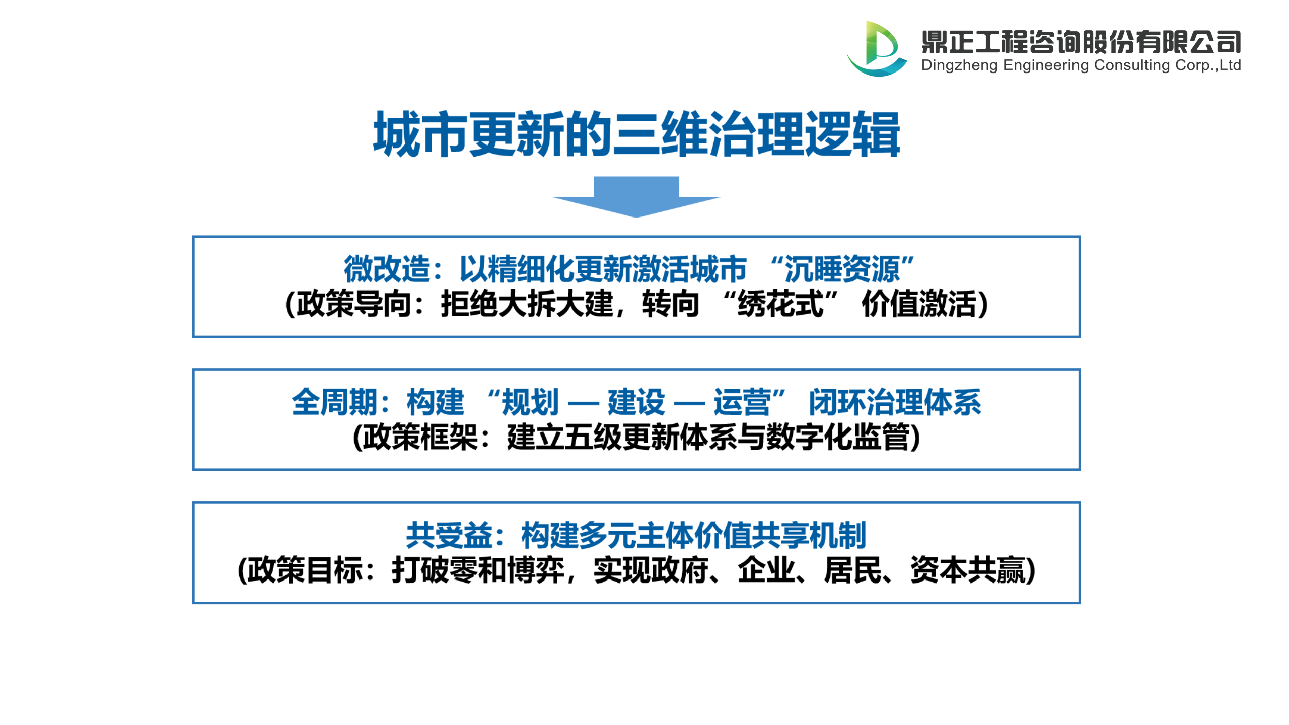 在城市更新的時代浪潮中,工程咨詢機構的破題之道在于以理念革新打破傳統路徑依賴,以路徑優(yōu)化構建價值創(chuàng)造能力,以機制創(chuàng)新整合多元生態(tài)資源。尤其是在《關于持續(xù)推進城市更新行動的意見》的指引下,未來,唯有以精準產業(yè)筑基錨定賽道優(yōu)勢,以可持續(xù)運營造血激活內生動力,以高效資本循環(huán)釋放乘數效應,才能在萬億市場中占據先機,成為城市高質量發(fā)展的“價值共創(chuàng)者”與“長期陪伴者”,最終實現人與城市的共生共榮。