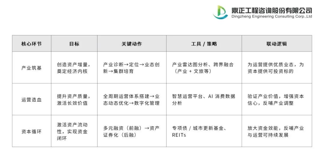 城市更新的本質是“產業(yè)價值發(fā)現 — 運營價值提升 — 資本價值實現”的過程。通過產業(yè)精準定位創(chuàng)造資產增量,運營精細化管理提升資產質量,資本工具創(chuàng)新激活資產流動性,最終形成“產業(yè)筑基 — 運營造血 — 資本循環(huán)”的可持續(xù)生態(tài),推動城市從“空間更新”邁向“價值再生”。